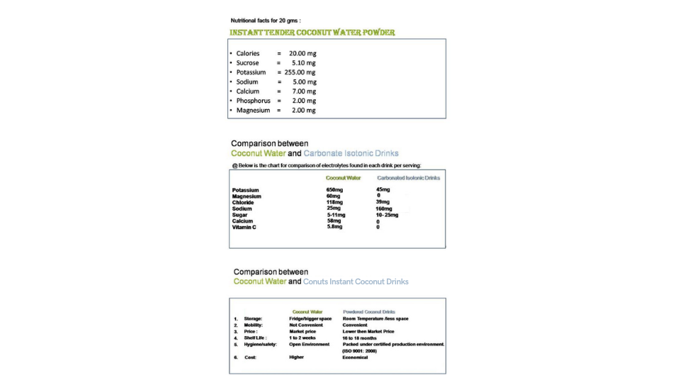 The low natural sugar content and nutritional properties found in coconut water, offers a low calorie alternative to soft drinks, while offering maximum health benefits. As a natural isotonic drink, Coconut contains key electrolytes needed to effectively hydrate the body. It is also a natural source of potassium, containing more per serving than found in 2 small bananas.